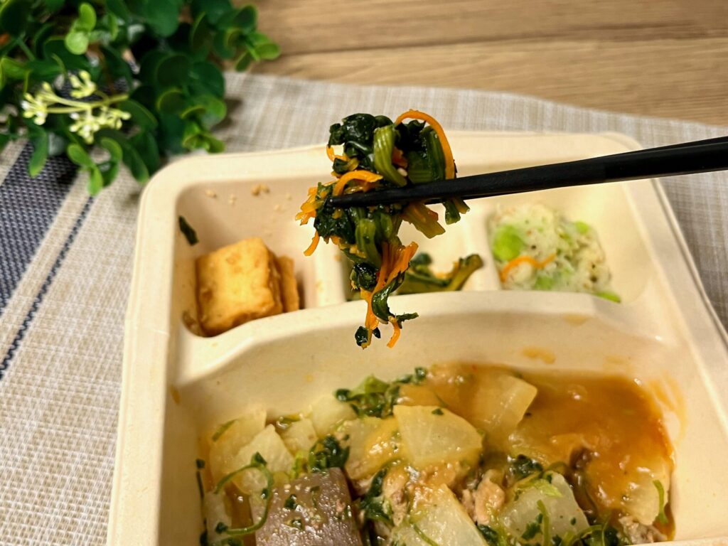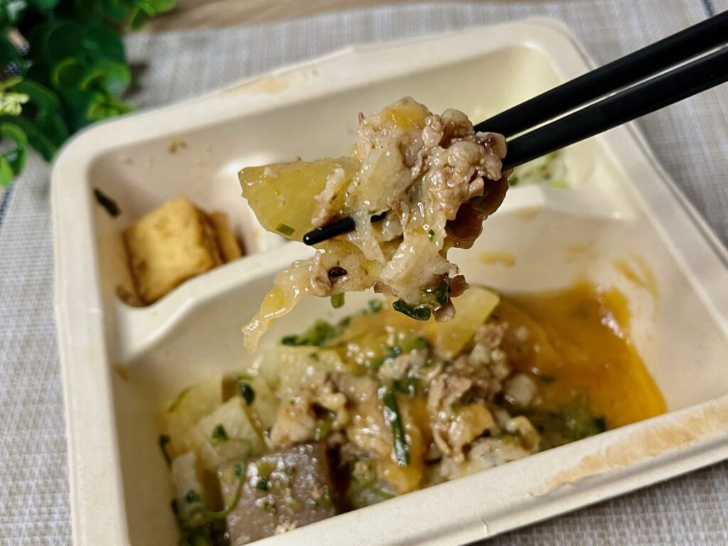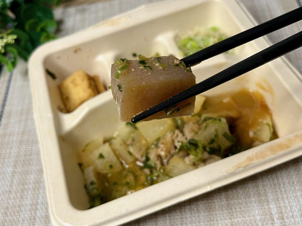 冷凍とは思えないやわらかさの牛肉と、味がしみた大根・こんにゃくがしっかり満足感を出してくれます。